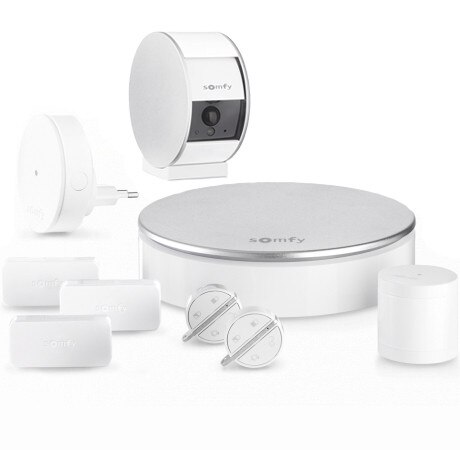 - Een all-in-one set van een beveiligingscamera en verschillende beveiligingsaccessoires die met die camera in verbinding staan. Voorbeeld: het Smart Home Startpakket Beveiliging Extra, een beveiligingscamera set die bestaat uit de Somfy Indoor Camera, de TaHoma, een bewegingsmelder, een openingsmelder en een binnensirene.