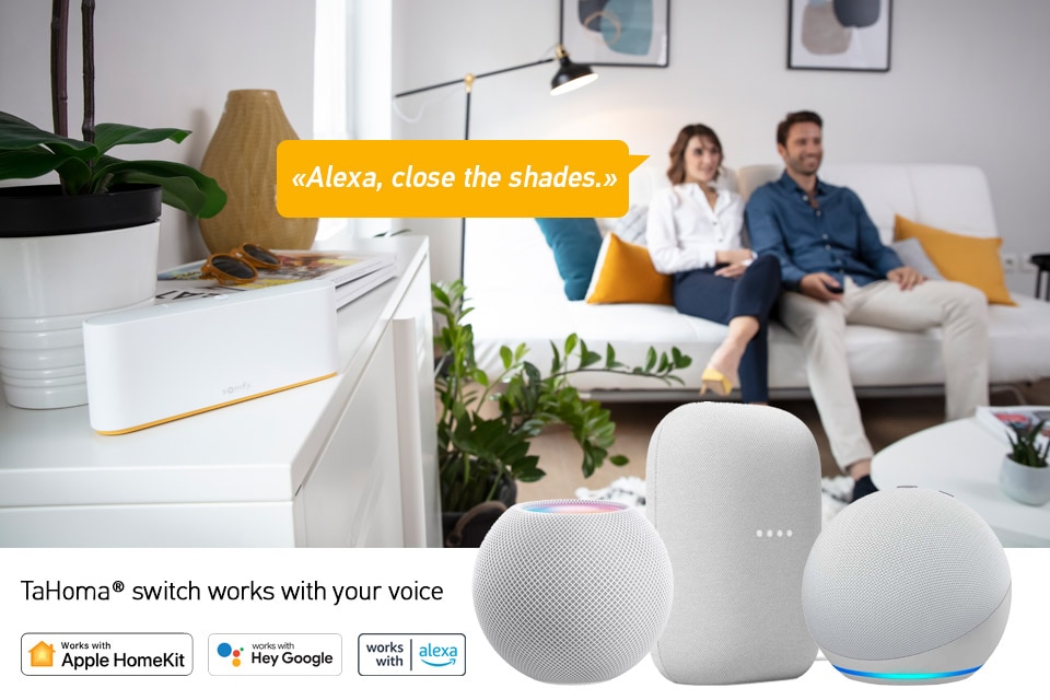 TaHoma® switch is compatibel met Google Assistant, Amazon Alexa en Apple HomeKit, wat de gebruikerservaring verbetert met spraakbesturing.